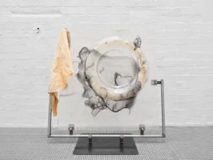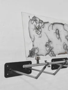In this new work, Bowman explores language, industry and secondary use of materials through a range of media, including glass, metal, rubber and ceramics. Bowman reshapes everyday industrial matter into fragile, fractured forms that speak of labour, repair and vulnerability. Glass headrests slump, tyres collapse, and welded supports cradle precarious fragments, objects balanced between humour and unease.