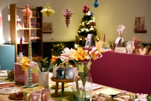 The collection continues with designer Laura Slater’s signature hand-printed homewares and Olivia Campbell’s delicately crafted paper flowers, works that combine artistry with a touch of festive magic. Tom Archer, Founder of Skógr Studio presents Cubism-inspired wooden homewears that blur the line between sculpture and design, while Katharine Tyrrell-Lewis showcases her beautifully wheel-thrown and hand-decorated ceramics.