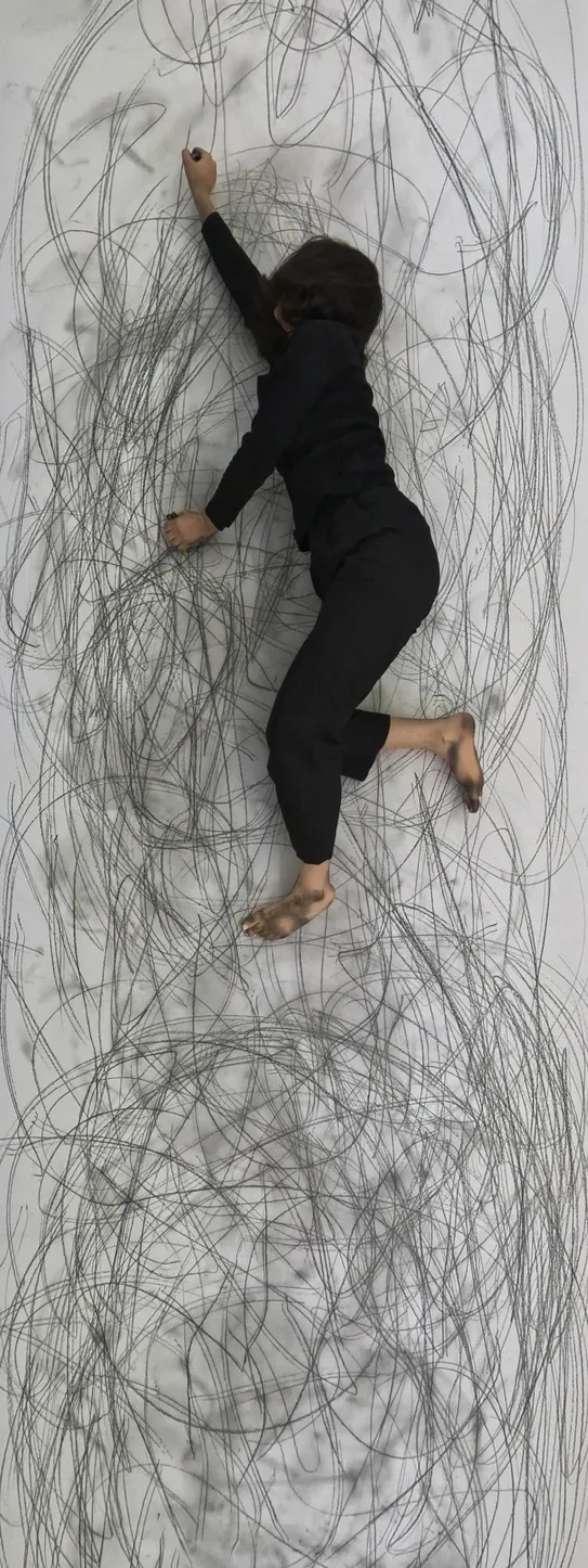 Behnaz Fatemi is a multidisciplinary artist who works across performance, drawing, video, and installation. Born in Iran and now living in Canada, Fatemi explores themes of displacement, mourning, the politics of care, as well as resistance and the notion of the third space- social environments outside the home where people can gather, interact and build community. She uses simple, everyday materials such as graphite, paper, fabric, and her own body to explore memory, trauma, and healing.