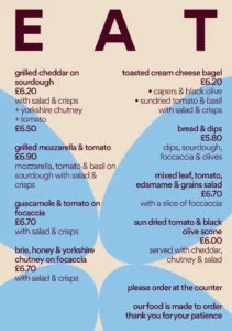 We serve barista-made drinks, fresh cakes and bakes, and a changing light lunch menu that follows the seasons. All of the produce we serve is locally and thoughtfully sourced including freshly baked bread and brownies from Cellar Door Micro bakery and coffee beans from local roasters Bean Brothers. We also offer a selection of loose leaf tea from Porter Hill Tea Company.